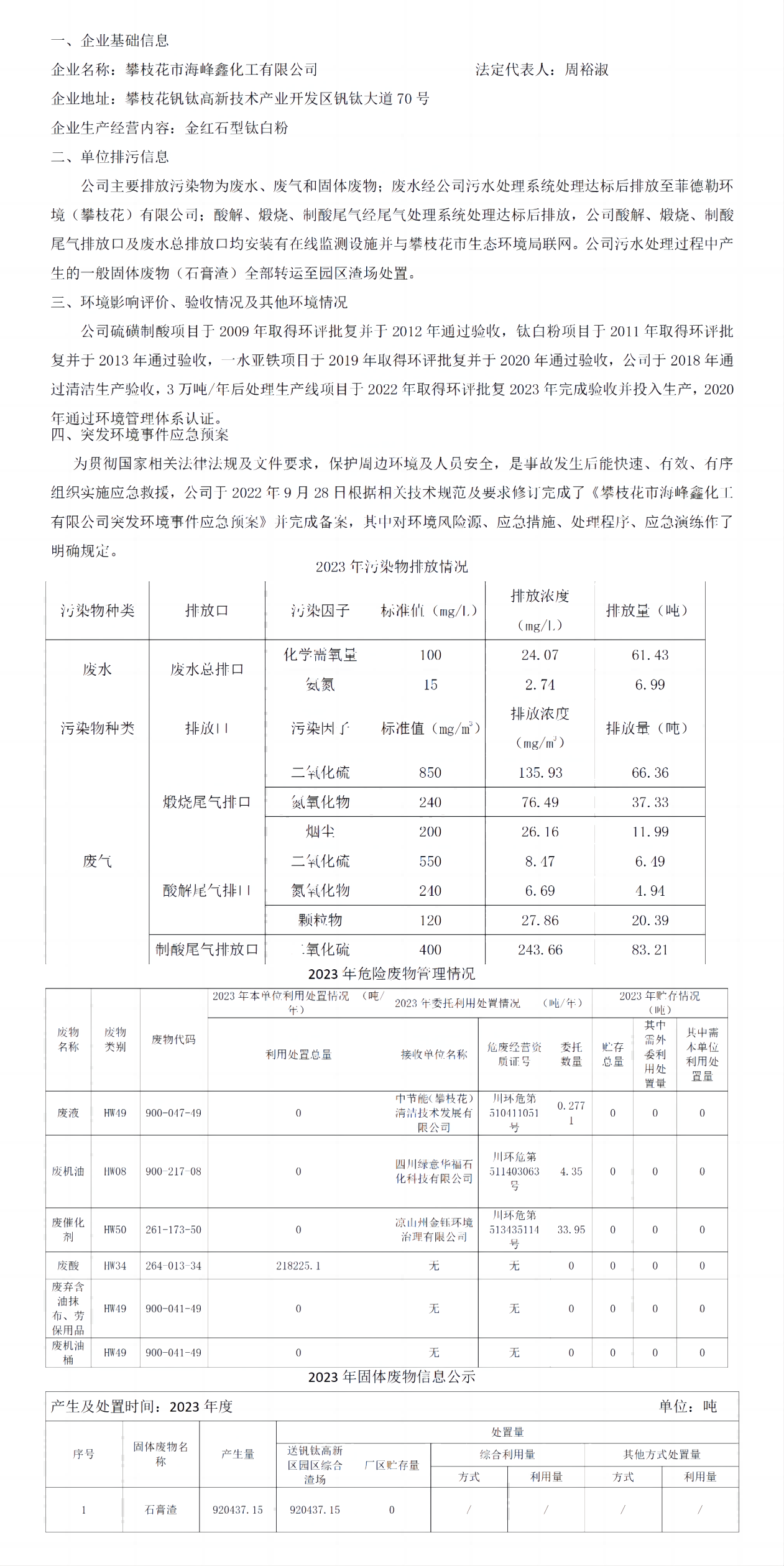 攀枝花市海峰鑫化工有限公司2023年環(huán)保公示